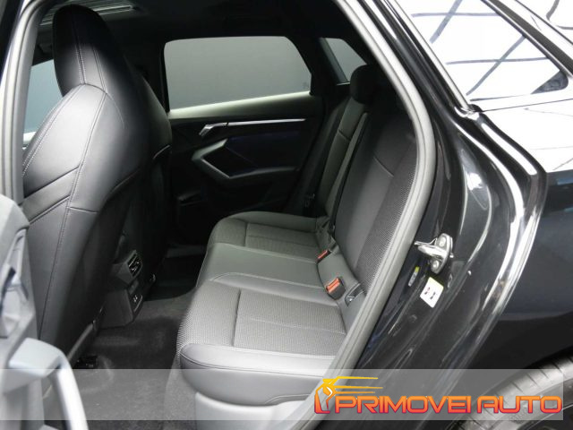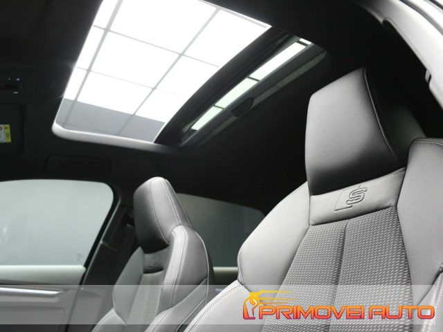 Mod. S LINE - Cambio automatico S tronic a 7 rapporti - EI/PWK Tessuto Pulse/Pelle Nero con cuciture grigio roccia - 1M5 Predisposizione per gancio traino - 3FB Tetto panoramico apribile in vetro - 4ZP Pacchetto look nero plus - 5MJ Inserto alla plancia in alluminio Spectrum scuro, accenti in grigio vulcano - 9VS SONOS 3D Premium Sound System - KA6 Telecamere perimetrali - PXC Proiettori a LED Audi Matrix con gruppi ottici posteriori a LED - PZC Pacchetto assistenza e parcheggio pro con pacchetto safety plus: Adaptive cruise assist con emergency assist, Assistente agli ostacoli con assistente alla svolta (turn assist), Assisted lane change, Audi pre sense rear (sistema assistenza al traffico trasversale posteriore), Audi pre sense basic, Sensori di parcheggio anteriori e posteriori con park assist plus, Side assist con exit warning e rear cross-traffic assist - QL5 Vetri laterali posteriori e lunotto oscurati - QQ3 Pacchetto luci d'ambiente pro - U35 Cerchi Audi Sport, design a 5 razze doppie a Y, nero metallizzato da 18" - UH2 Freno di stazionamento elettromeccanico con assistenza alla partenza - Vernice - Di Serie: - 1G8 Kit riparazione pneumatici - 1XX Volante multifunzionale sportivo in pelle con Tiptronic - 3L3 Sedili anteriori regolabili manualmente - 3NZ Schienale del sedile posteriore ribaltabile - 4G3 Assistente agli ostacoli con assistente alla svolta (turn assist) - 6E3 Appoggiabraccia centrale anteriore - 6Y2 Impianto di regolazione della velocità incluso limitatore della velocità - 7B9 Porte USB tipo C posteriori - 8N6 Sensore pioggia/luci - I8Y MMI Radio Plus - IU1 Smartphone Interface - PYC Pacchetto Climatizzazione plus: 4A3 Sedili anteriori riscaldabili, KH5 Climatizzatore automatico a tre zone - PYY Pacchetto Comfort Plus: 4L6 Specchietto retrovisivo interno schermabile automaticamente, senza cornice, 6XI Specchietti retrovisivi esterni regolabili, riscaldabili, ripiegabili elettricamente e con antiabbagliamento, 7P1 Supporto lombare a 4 vie per i sedili anteriori, a reg. elettrica in senso orizzontale e verticale - QR9 Sistema di riconoscimento della segnaletica basato su telecamera - QV3 Ricezione Radio digitale (DAB) - ACCESSORI DA VERIFICARE